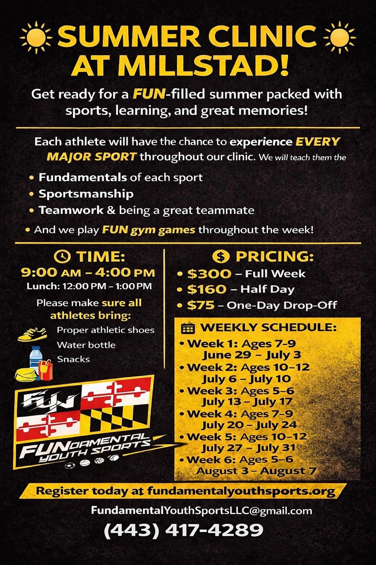 Choose a full week, half day, or single-day drop-in. Athletes will jump into a rotating mix of sports like soccer, baseball, basketball, floor hockey, football, plus fun gym games and surprises every day!